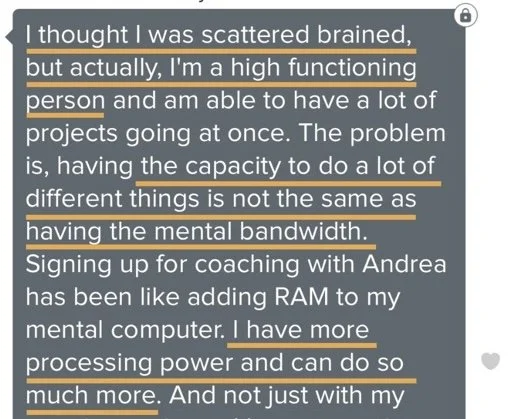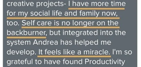 “After working with Andrea, I have finished and submitted two book proposals, finished writing a short film, and finished editing another short that is now circulating film festivals. My film pipeline is now digitally organized and no longer congested, leaving mental space for me to not just share my creativity with the world, but give attention to other areas of my life. She even helped me make a personal dashboard that supports my energy management and self care, which wasn't getting prioritized before working together.“