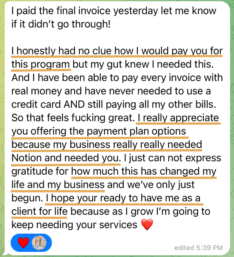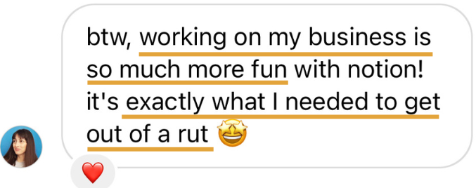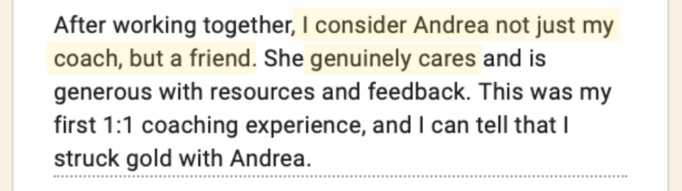 “My experience working with Andrea has been nothing short of amazing. The systems she was able to create for me within Notion have not only changed my business but changed my life. This work is going to take my business to the next level, my only regret is that I didn't find her sooner!