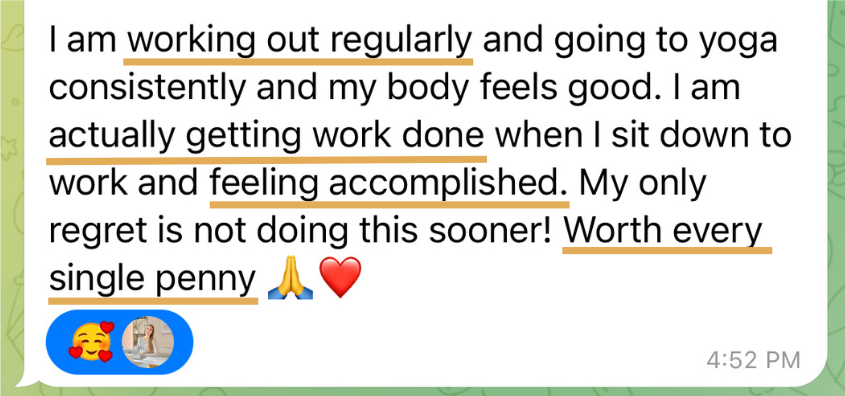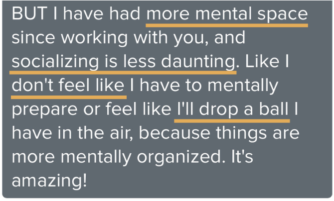 “The mental clutter is gone. I no longer feel overwhelmed, and I'm not procrastinating on my projects anymore. I have systems in place that make working on my business fun and doable.“