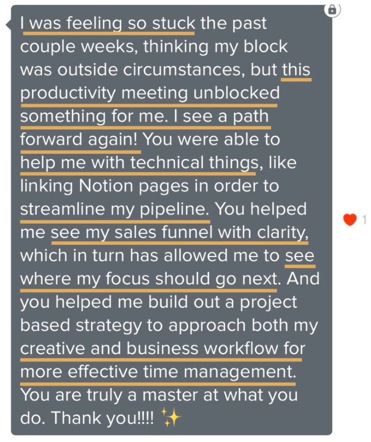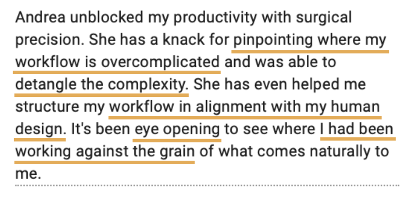 The testimonials, case studies and messages below are from clients who went through Productive by Design — a coaching program in which we build a custom digital workspace aligned with the client’s business & Human Design. All of them are shared with permission.