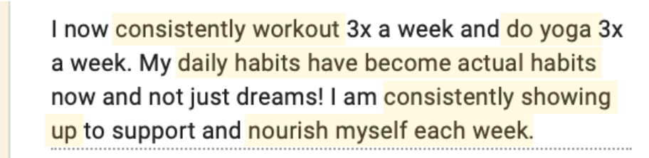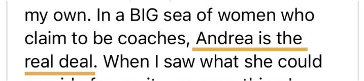 “I feel much more at peace. I am much more productive and aligned with my goals. I have seen a big increase in success with my clients as well. […] my work with Andrea has literally changed my life. I am consistently showing up for myself and my daily success habit and health habits. I now have a system for my workouts, my social media, my client management, my personal finances. I feel really supported using this system to grow my business!“