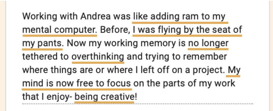 “Before working with Andrea, I was disorganized. I'm a creative and have many projects in the air at the same time. I was making slow progress on my many projects, always close to the finish line but never quite getting there.”
